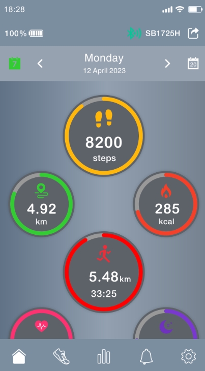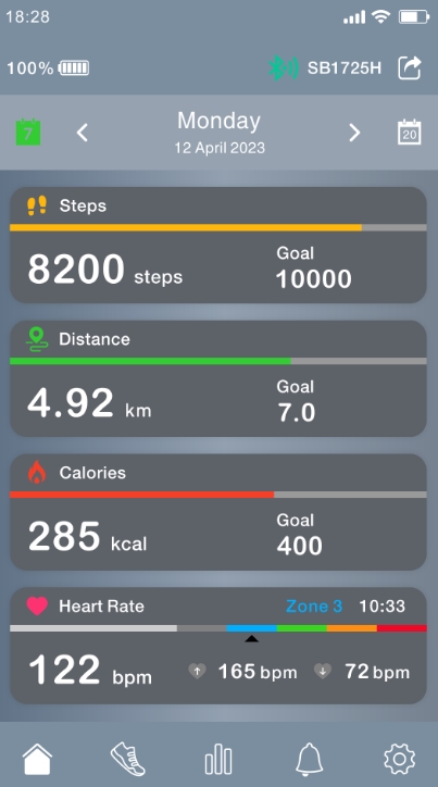实时监测:记录步数、距离、燃烧的卡路里等数据,并通过图形化界面直观展示运动趋势。