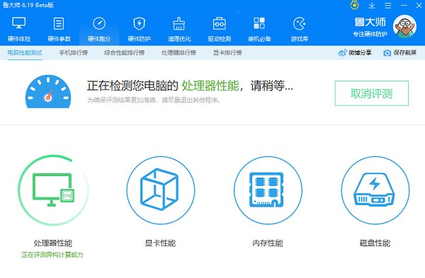 2、点击开始测评,即可对电脑的各个方面性能进行跑分,时间比较长,请耐心等待